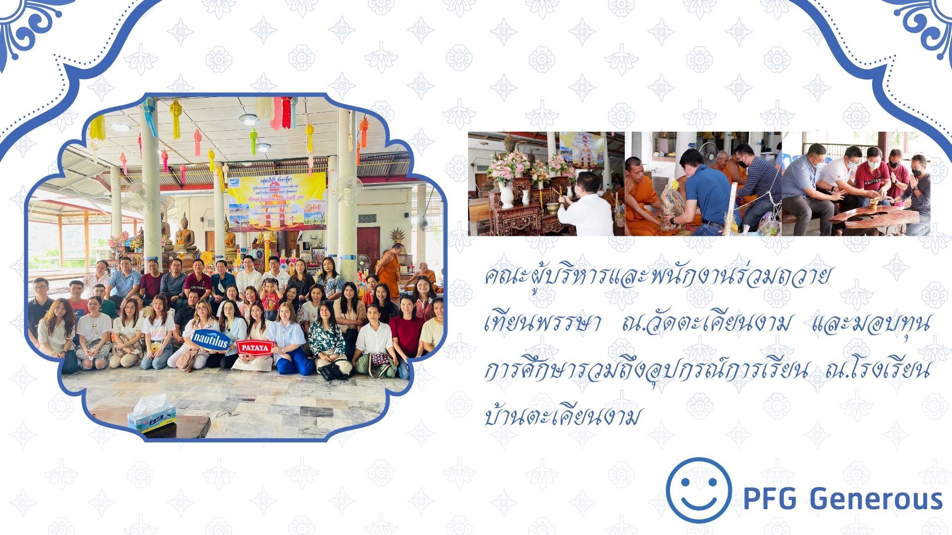 เมื่อวันอาทิตย์ ที่ 23 กรกฎาคมที่ผ่านมา บริษัท พัทยาฟู้ดกรุ๊ป ได้จัดกิจกรรม ทำบุญสืบสานประเพณีไทย ด้านพระพุทธศานา ถวายเทียนพรรษา ณ.วัดลำตะเคียน และนอกจากนี้ยังมีกิจกรรม มอบทุนการศึกษาและอุปกรณ์การเรียน – กีฬา ให้แก่โรงเรียนบ้านตะเคียนงาม ซึ่งเป็นกิจกรรมที่สะท้อนภาพ DNA Generous ของชาวพัทยาฟู้ด ได้เป็นอย่างดีเยี่ยม ทาง HR ได้รวบรวมภาพในกิจกรรม มาฝากชาวพัทยาฟู้ดกันค่ะ
