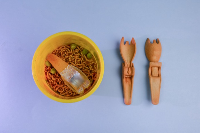 เราจะเจอ “ส้อมพลาสติกแบบพับ” ที่แบรนด์ผู้ผลิตให้มาอยู่ในถ้วยบะหมี่ฯ